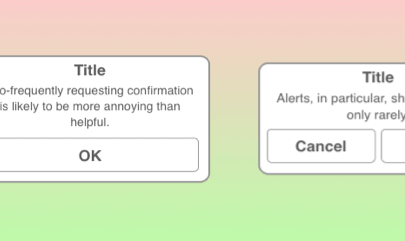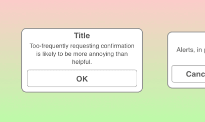 " 對話框 " 是一種以文字與使用者對話的使用者介麵。其中,「警告對話框」(Alerts,以下簡稱警告框)通常用於通知使用者發生了錯誤或警告,並詢問接下來的操作(同意、不同意等等)。使用警告框時必須十分注意,因為使用者並不希望正在進行中的工作受到打擾。
