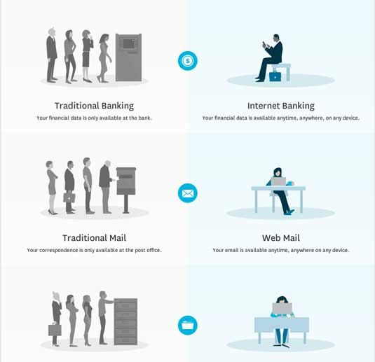上圖中的雲計算指南使用了平麵圖形和圖解的組合來展示在工作中使用雲的各種優勢。圖像的簡單性使得用戶可以輕鬆理解信息。
