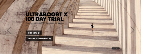 Adidas在網店使用輪播聚焦運動鞋與T恤,並使用自動播放展示所有四種產品。