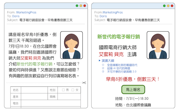 很顯然,右邊的電子郵件更能幫助有興趣的人快速掌握主題,並且讓他們在理解重點之後,選擇是否要進一步閱讀相關的詳細資訊。