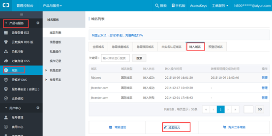 5、登錄阿裏雲/萬網【管理控製台】- 【域名】- 進入【域名轉入】- 填寫需轉入域名(包括後綴)和域名轉入密碼,域名轉入需符合規則 - 選擇一個【已實名認證】的信息模板,點擊【下一步】,提交訂單、立即結算 - 按照流程指引完成即可。如下圖所示: