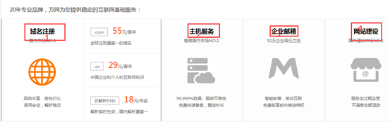 萬網包括域名注冊、主機服務、企業郵箱、網站建設4部分。