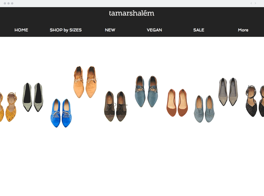 鞋類設計師Tamar Shalem在zai網wang站zhan使shi用yong動dong畫hua吸xi引yin訪fang客ke。一yi打da開kai網wang站zhan你ni就jiu會hui發fa現xian它ta的de獨du特te之zhi處chu。頁ye眉mei的de動dong畫hua,加jia上shang可ke愛ai的de菜cai單dan圖tu標biao,時shi髦mao的de鞋xie子zi,閃shan爍shuo的de消xiao息xi展zhan示shi促cu銷xiao活huo動dong,加jia在zai一yi起qi這zhe基ji本ben上shang就jiu是shi一yi個ge讓rang人ren無wu法fa忘wang記ji的de網wang店dian。