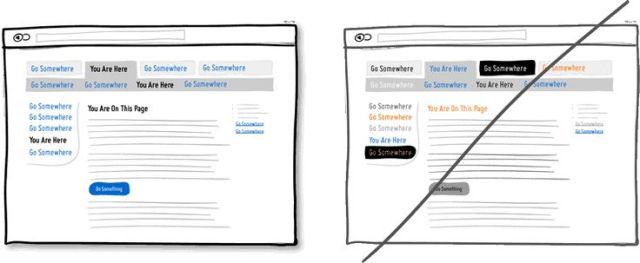 應用視覺元素之手法可以幫助使用者了解頁麵上的功能與結構,例如顏色、深度與對比度等。同時為了與你的使用者精準的溝通,需點擊的行為(如連結或按鈕)與需選擇的元件(如選單)設(she)計(ji)上(shang)要(yao)有(you)所(suo)區(qu)別(bie),同(tong)時(shi)上(shang)方(fang)的(de)文(wen)字(zi)必(bi)須(xu)描(miao)述(shu)清(qing)楚(chu),才(cai)有(you)利(li)使(shi)用(yong)者(zhe)辨(bian)別(bie)。在(zai)底(di)下(xia)的(de)例(li)子(zi)中(zhong),作(zuo)者(zhe)選(xuan)擇(ze)了(le)藍(lan)色(se)做(zuo)為(wei)網(wang)站(zhan)上(shang)使(shi)用(yong)者(zhe)可(ke)點(dian)擊(ji)元(yuan)件(jian)的(de)主(zhu)色(se),而(er)黑(hei)色(se)為(wei)標(biao)示(shi)已(yi)選(xuan)擇(ze)的(de)項(xiang)目(mu)或(huo)是(shi)現(xian)在(zai)頁(ye)麵(mian)的(de)名(ming)稱(cheng),簡(jian)單(dan)明(ming)顯(xian)的(de)顏(yan)色(se)應(ying)用(yong),讓(rang)使(shi)用(yong)者(zhe)藉(ji)由(you)顏(yan)色(se)的(de)線(xian)索(suo)更(geng)輕(qing)易(yi)的(de)學(xue)習(xi)和(he)使(shi)用(yong)網(wang)站(zhan)功(gong)能(neng)。最(zui)後(hou)請(qing)記(ji)得(de),千(qian)萬(wan)別(bie)使(shi)用(yong)難(nan)以(yi)辨(bian)識(shi)或(huo)過(guo)多(duo)的(de)顏(yan)色(se)混(hun)淆(xiao)使(shi)用(yong)者(zhe)。