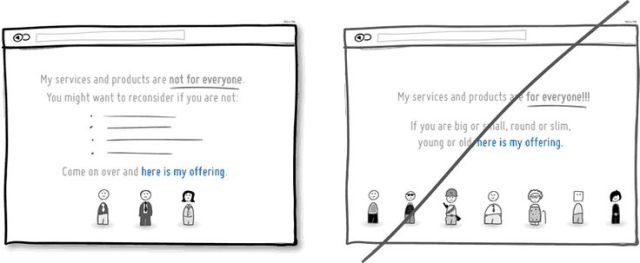 描miao述shu或huo限xian製zhi適shi合he產chan品pin或huo服fu務wu的de目mu標biao族zu群qun,可ke以yi幫bang助zhu網wang站zhan找zhao到dao更geng多duo相xiang似si特te質zhi的de使shi用yong者zhe,也ye更geng具ju特te色se,同tong時shi讓rang使shi用yong者zhe感gan到dao自zi己ji具ju獨du特te性xing。然ran而er,使shi用yong這zhe樣yang策ce略lve具ju有you風feng險xian,可ke能neng讓rang你ni的de網wang站zhan在zai短duan期qi內nei失shi去qu一yi些xie潛qian在zai用yong戶hu。不bu過guo,透tou明ming與yu誠cheng實shi才cai是shi建jian立li與yu使shi用yong者zhe之zhi間jian信xin任ren的de最zui佳jia方fang式shi。