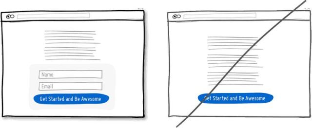 當頁麵上有一些我們期望使用者做,並會帶來價值的功能時(例如留下聯絡方式),最好可將實際的表單或欄位放置於本頁上。如下圖,欄位若能與頁麵整合在同一層,其帶來的好處大於還要連結至別頁輸入的方式。