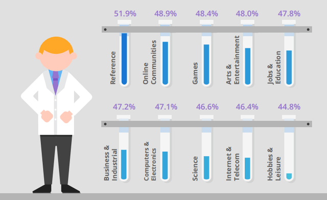 廣告投放的平台之屬性(內容或產業)會深深影響可見度,特別是與使用者頻繁互動的類型有較佳的表現。例如: 資訊提供網站(51.9%)、社群(48.9%)、遊戲(48.4%)、藝術及娛樂(48%)、工作與教育(47.8%)、商業及產業(47.2%)、電腦及電子(47.1%)….等。
