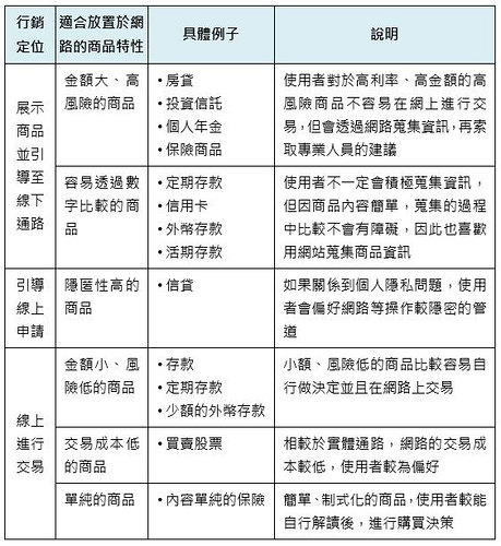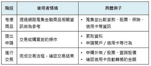 了解使用者的行為模式後,我們便可進一步整理各階段使用者的行為特征,以便了解各金融商品適合的網站行銷定位。